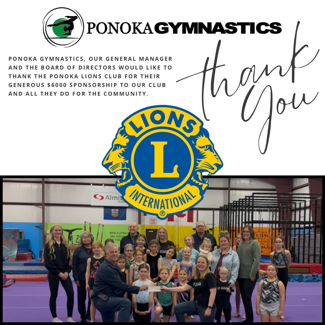 Ponoka Gymnastics, our GM and the Board of Directors would like to thank the Ponoka Lions Club for their generous sponsorship of $6000 towards our facility.